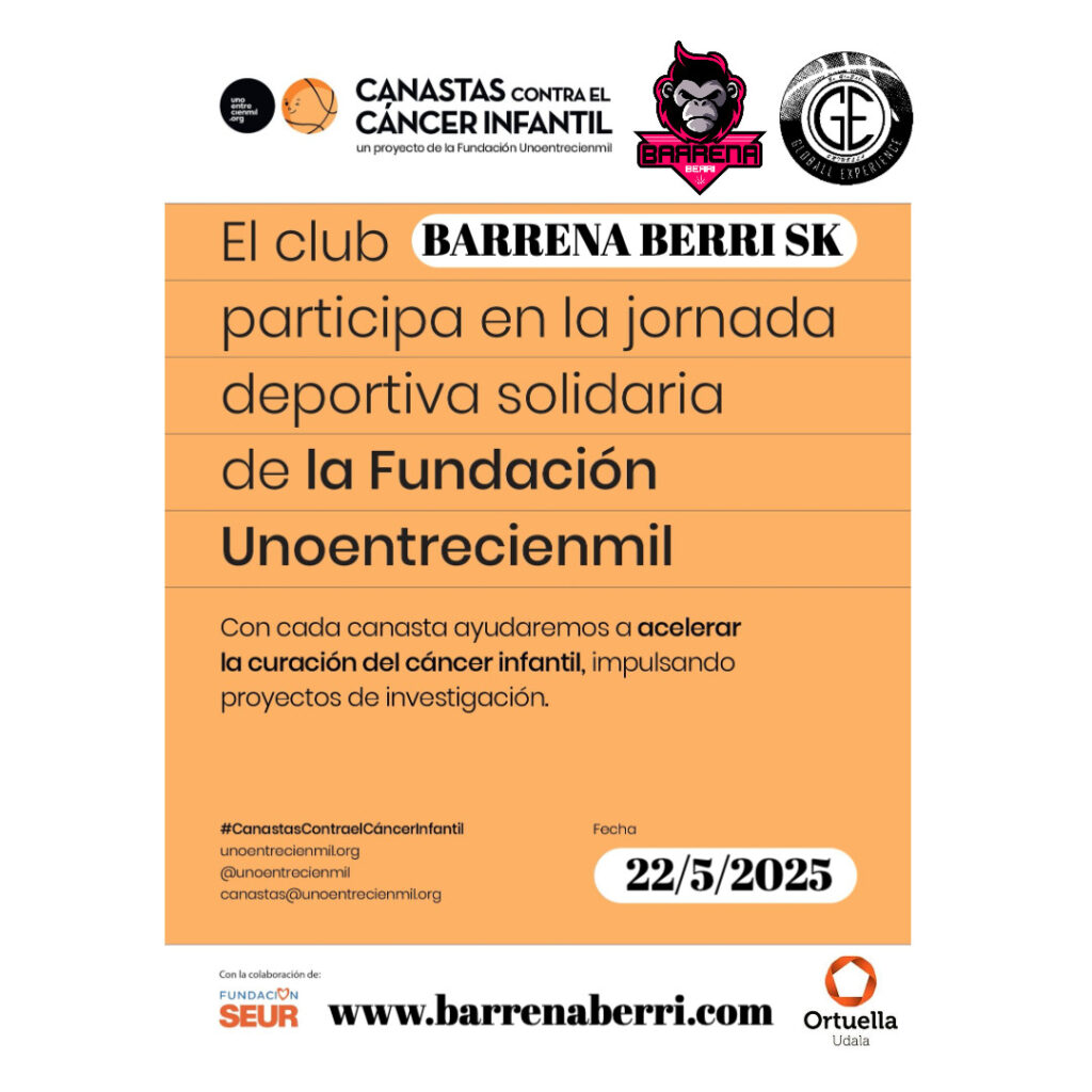 ORTUELLA, SÁBADO 22 FEBRERO. – EL próximo sábado 22 de febrero el Club BARRENA BERRI SK participará en la edición 2025 de Canastas Contra el Cáncer Infantil convirtiendo toda su energía en las canchas en fondos para impulsar proyectos de investigación que curen esta enfermedad que cada año es diagnosticada en 1.300 niños y niñas de nuestro país.
